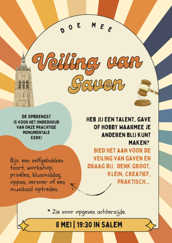 Op vrijdagavond 8 mei organiseren wij een Veiling van gaven. De avond start om 19:30 uur. Op deze avond worden gaven geveild die door mensen zijn beschikbaar gesteld.
